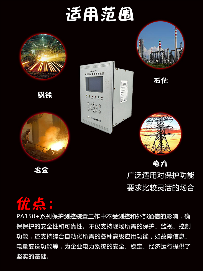 PA150+系列微机综合保护测控装置是从企业电源系统的旧PA150升级而来的新型“四合一”综合保护和控制设备。它适用于石化,钢材,冶炼等行业以及电力行业。需更灵活的保护功能的场合。